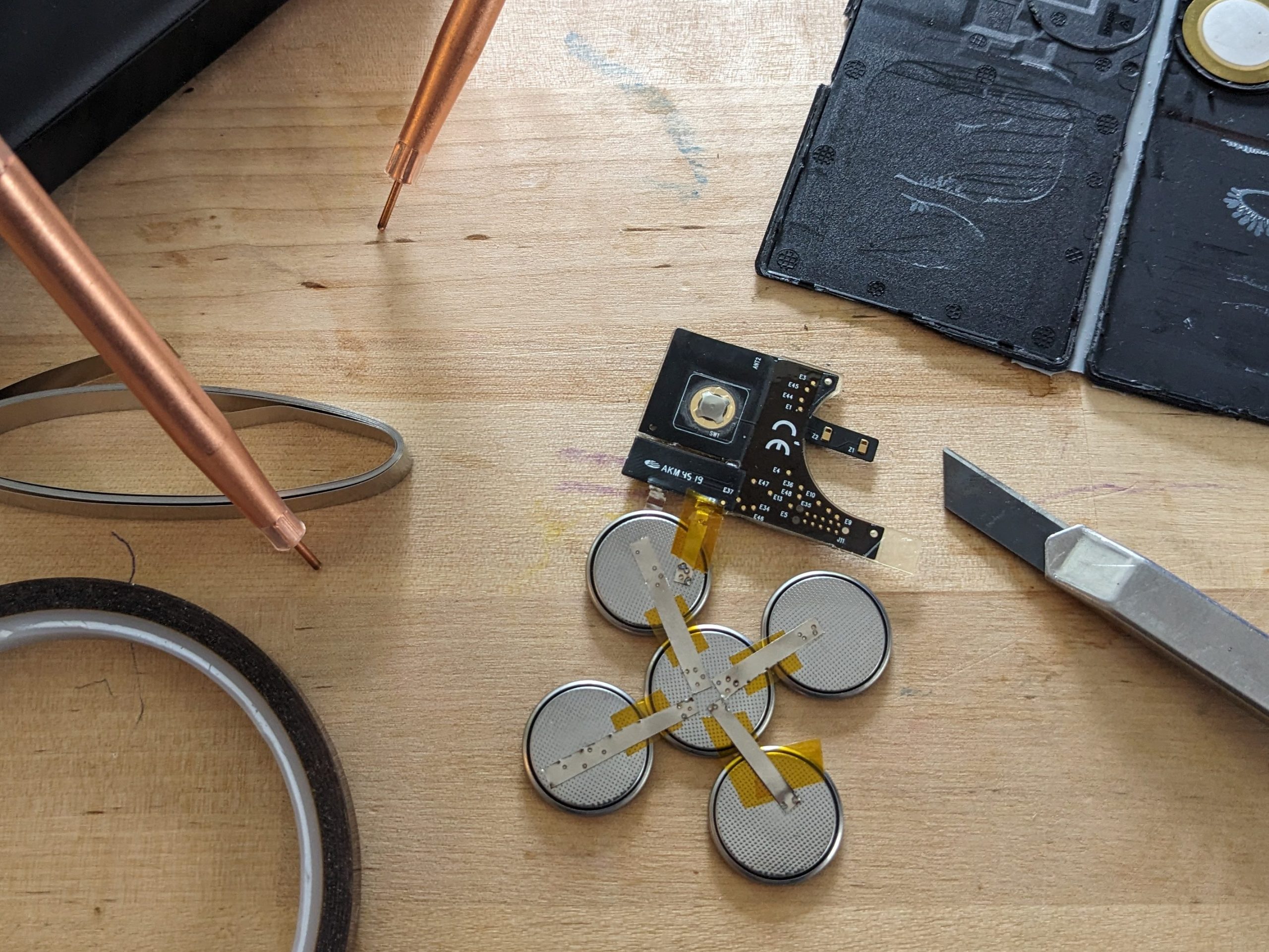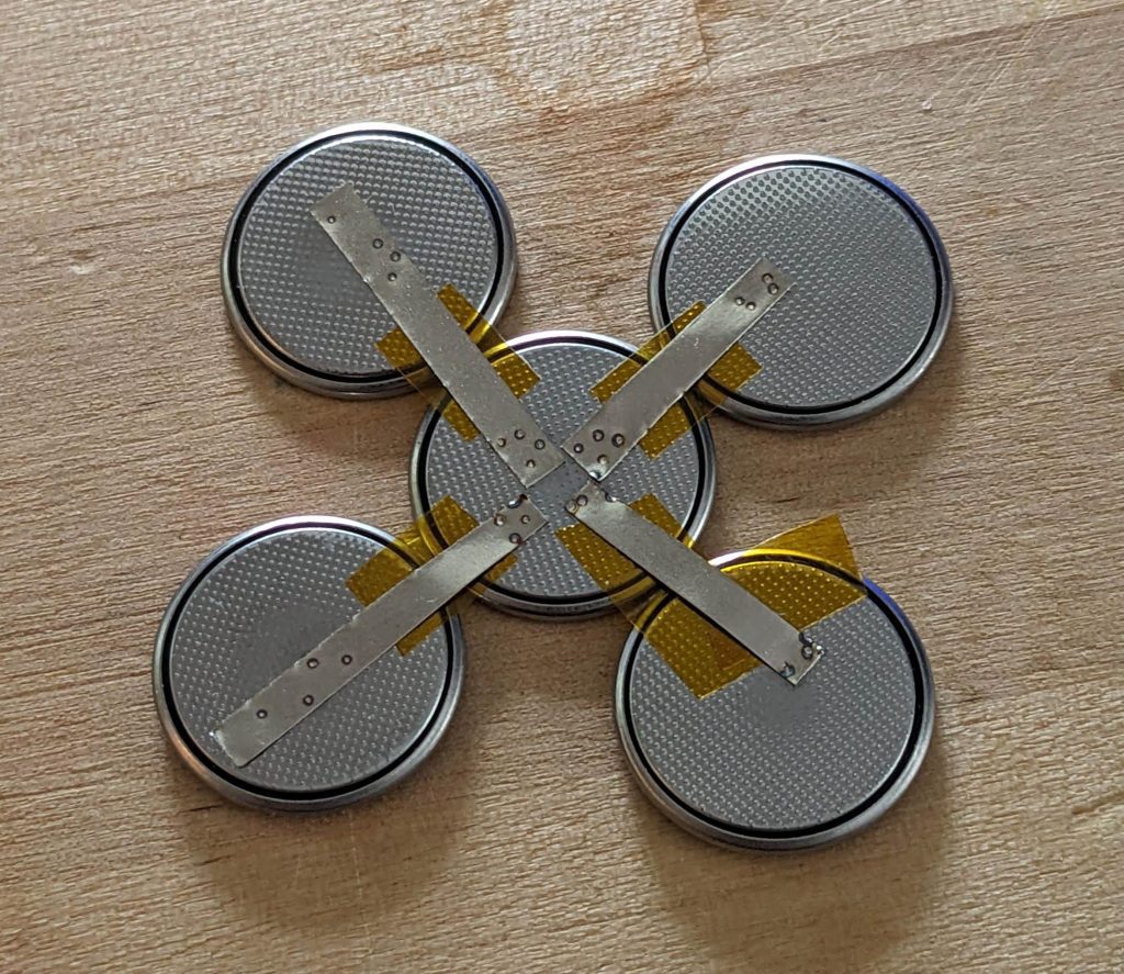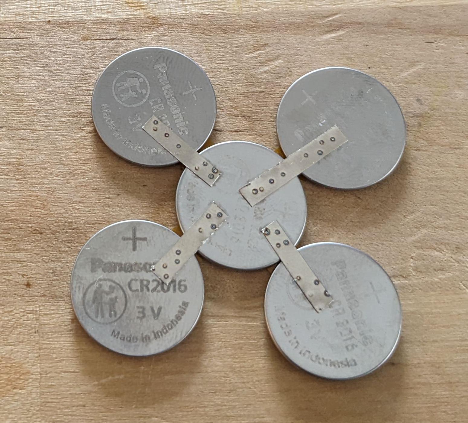 The pouch cell plus the stainless-steel plus the glue is about 0.0580″ (1.48mm). I wanted to stick close to that but figured going over a bit was ok. With a bit of measuring I figured out I could just fit five CR2016 0.787×0.0629″ (20×1.6mm) batteries in parallel in the case in a “X” configuration.